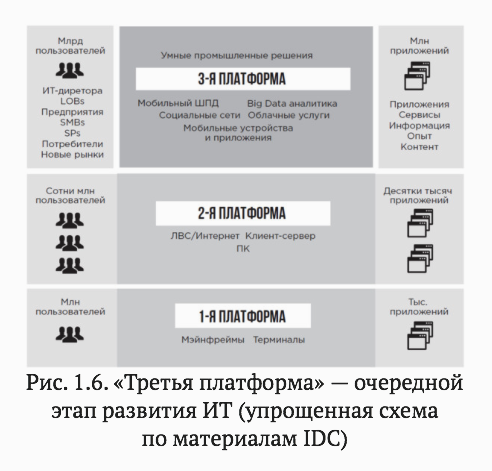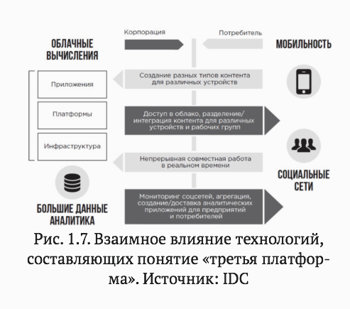 Напомним читателю, что "Третья платформа" получила свое название, поскольку следует третьей в ряду эволюции платформ (рис.1.6). Первая платформа была реализована на базе мейнфреймов и терминалов, вторая – на основе ПК и клиент-серверной архитектуры, и, наконец, третья платформа – на базе различных, в том числе мобильных, устройств, мобильного интернета, социальных сетей, облачных технологий, которые лежат в основе построения всевозможных решений "умной" экономики./%D0%BF%D1%80%D0%BE%D1%85%D0%BE%D1%80%D0%BE%D0%B2/%D0%A1%D0%BD%D0%B8%D0%BC%D0%BE%D0%BA%20%D1%8D%D0%BA%D1%80%D0%B0%D0%BD%D0%B0%202018-11-14%20%D0%B2%2011.55.45.png?width=492&name=%D0%A1%D0%BD%D0%B8%D0%BC%D0%BE%D0%BA%20%D1%8D%D0%BA%D1%80%D0%B0%D0%BD%D0%B0%202018-11-14%20%D0%B2%2011.55.45.png)