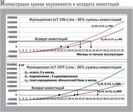 Компания “ВИСАТ-ТЕЛ” в 2017– 2018 гг. выполнила ряд инициативных НИР и аналитических исследований, результаты которых подтверждают, что сегмент спутникового M2M/IoT перспективен и относительно свободен. Некоторые результаты этих исследований представлены в [1, 2]. Как показывает анализ, система, использующая большое число микроспутников на низкой орбите, является потенциально перспективной, в том числе для обслуживания арктических регионов. Анализы затрат и сроков окупаемости подобного рода системы с целевой функцией M2M/IoT являются экономически привлекательными. На рисунке представлена иллюстрация оценки сроков окупаемости и сроков возврата инвестиций при ценовых параметрах предоставляемых сервисов и абонентского оборудования, практически эквивалентных применимым в наземных сетях LPWAN. Но любая такая система должна рассматриваться как международная.
