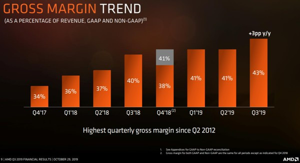 Валовая прибыль AMD за III квартал 2019 г. составила 43%, увеличившись на 3 п.п. по сравнению с тем же кварталом прошлого года и на 2 п.п. по сравнению с предыдущим кварталом. Ключевым драйвером роста стали продажи процессоров Ryzen и Epyc.