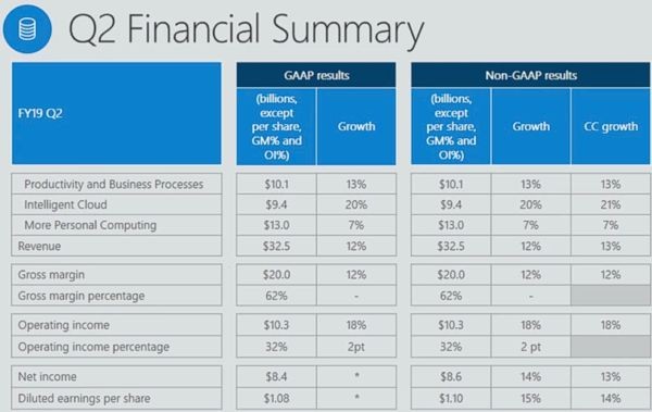 Квартальная выручка Microsoft составила $32,5 млрд, увеличившись на 12% по сравнению с аналогичным периодом предыдущего года. Операционная прибыль компании составила $10,3 млрд, увеличившись по сравнению со вторым кварталом 2018 г …