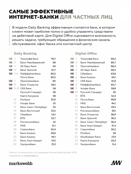 Тинькофф Банк, набрав 78,7 баллов из 100 возможных, вернул себе первое место в рейтинге Internet Banking Rank 2019 для частных лиц, ежегодно составляемом компанией Markswebb Rank & Report. На втором …