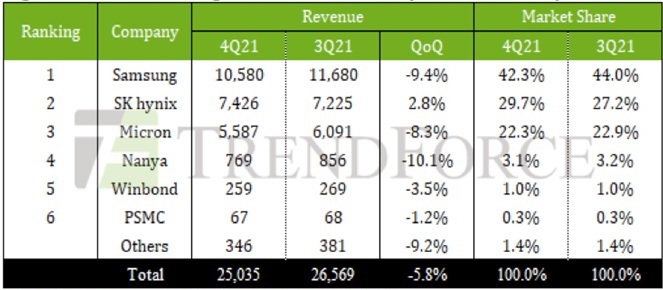 По данным Trendforce в IV кв. 2021 г. общий объём выпуска микросхем DRAM снизился на 5,8% квартал к кварталу в денежном выражении, достигнув уровня 25,03 млрд долл. США. За исключением …
