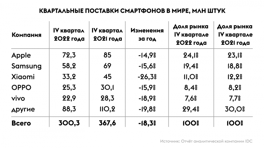 Мировые поставки смартфонов сократились на 18,3% год к году в четвёртом квартале 2022 года и составили 300,3 млн штук., подсчитала аналитическая компания International Data Corporation (IDC). По данным организации, это …