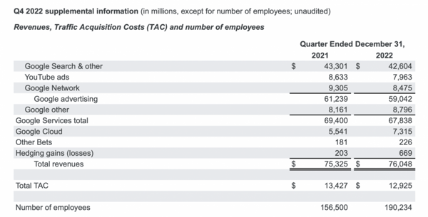 Общий рекламный доход Google в четвёртом квартале составил $59,04 млрд, что меньше на 3,5%, чем за аналогичный период 2021 года — $61,2 млрд. Выручка от поисковой и прочей деятельности составила $42,6 млрд. В 2021 году этот показатель был на уровне $43,3 млрд.
