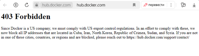 В ночь на 30 мая 2024 года сервис Docker Hub ограничил доступ для пользователей из России. При попытке зайти на сайт сервиса из России появляется заглушка, что Docker является американской компанией и должна соблюдать правила экспортного контроля США.