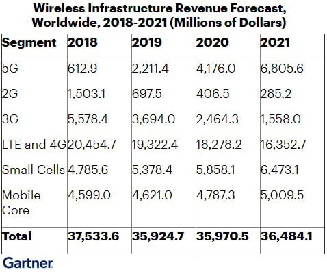 Исследовательская и консалтинговая компания Gartner опубликовала прогноз, согласно которому мировые инвестиции в инфраструктуру сетей 5G в 2020 году составят $4,2 млрд, сообщает портал КО. Что будет означать рост почти вдвое (на 89%) по сравнению с объемом 2019 года.