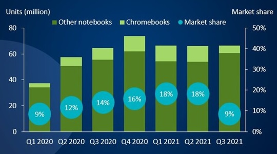 Интересно, что поставки ноутбуков — пожалуй, наиболее адекватных непростым коронакризисным реалиям цифровых рабочих инструментов — в третьем квартале текущего года вернулись примерно к тому же рекордному уровню, которого достигли в IV кв. 2020-го (см. рисунок). Наиболее же внушительный спад продемонстрировали ситуативно востребованные разновидности ПК в широком смысле: планшеты (37,7 млн единиц за квартал; на 15% меньше, чем годом ранее) и хромбуки (5,8 млн единиц; —37%).
