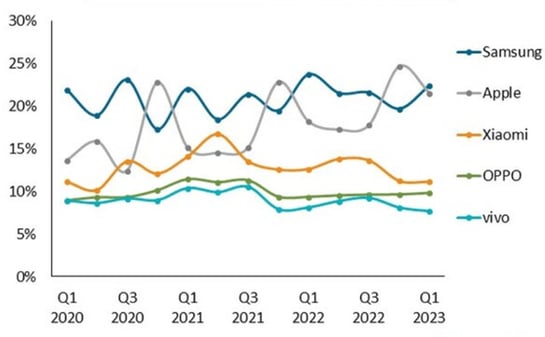 По воспроизводящемуся уже не первый год сценарию Samsung вновь обошла Apple по занимаемой доле в этом сегменте мирового ИТ-рынка (обычно три первые квартала каждого года лидирует южнокорейский вендор, а в четвёртом вперёд вырывается американский) хотя разрыв в данном случае оказался минимальным. Доля Xiaomi, заметно просевшая ещё в IV кв. 2022-го, не демонстрирует признаков восстановления, а другие два китайских гранда, Oppo и Vivo, продолжают с некоторыми колебаниями удерживать свои 8-10% суммарных смартфонных отгрузок каждый.