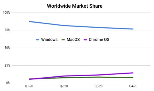 Недавний отчёт IDC об итогах 2020 г. для глобального рынка ПК содержит важную деталь, которая заслуживает особо пристального рассмотрения, пишет ITBestsellers. А именно: прошлый год стал первым в истории компьютерного рынка, когда поставки устройств под управлением macOS оказались меньше, чем систем с Chrome OS.