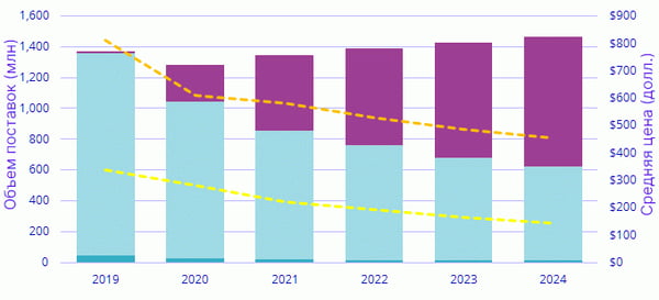 В 2020 году доля смартфонов с поддержкой 5G в мировом объеме продаж дойдет почти до 10%, а к 2024 году вырастет до 29%. Основным фактором роста станет снижение стоимости до уровня смартфонов 4G — в 2020 году средняя цена смартфонов с поддержкой 5G снизится на 25% до 611 долл., а к 2024 году упадет до 453 долл. Потребители в условиях пандемии COVID-19 стремятся экономить деньги, но активное продвижение и падение цен в краткосрочной перспективе может частично скомпенсировать влияние этого фактора, полагают аналитики.
