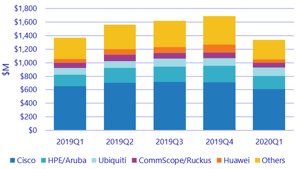 Мировой объем продаж оборудования для беспроводных локальных сетей (WLAN) потребительского и корпоративного уровня в сумме в первом квартале 2020 года вырос по сравнению с прошлым годом на 2,3%. При этом объем корпоративного сегмента упал на 2,2% до 1,3 млрд долл. Аналитики IDC связывают падение с пандемией COVID-19 и последующей остановкой экономики на карантин.