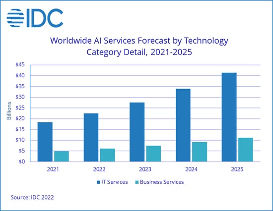 В сфере ИИ-сервисов совокупный доход от всех видов IT-сервисов в первой половине прошлого года составил $18,4 млрд. Таким образом, годовой прирост составил 20,4%. Предполагается, что к 2025 году доход составит $52,6 млрд.