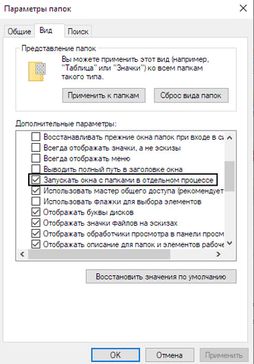 Чтобы самостоятельно активировать функцию запуска отдельного процесса проводника для каждой открываемой в новом окне папки, пользователю необходимо в «Проводнике» перейти в меню «Файл» и выбрать пункт «Изменить параметры папок и поиска». Затем в появившемся окне на вкладке «Вид» в секции «Дополнительные параметры» установить флажок напротив пункта «Запускать окна с папками в отдельном процессе». После этого изменения необходимо подтвердить при помощи нажатия на кнопку «ОК».