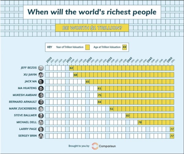 Для вычисления этих данных компания проанализировала собственный капитал 25 самых богатых людей в мире по данным Forbes за последние пять лет. Затем был вычислен среднегодовой процент прироста в каждом выбранном случае и построены предположения, как ситуация будет развиваться дальше.