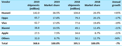 Первую пятёрку по поставкам смарфонов в материковом Китае по итогам всего 2019 г. образуют Huawei (142,0 млн аппаратов, 38,5% рынка), Oppo (65,7 млн и 17,8%), Vivo (62,7 млн и 17,0%), Xiaomi (38,8 млн, 10,5%) и Apple (27,5 млн, 7,5%).