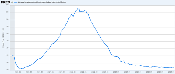 Согласно данным FRED (Federal Reserve Economic Data), индекс вакансий в сфере разработки программного обеспечения достигал 230 пунктов в 2022 году, но теперь рухнул до отметки 70, что отражает резкое падение спроса на специалистов, пишет Securitylab.