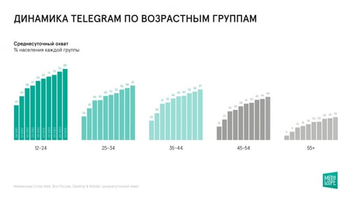 Согласно данным Mediascope, охваты Telegram растут во всех возрастных группах. Самые активные пользователи мессенджера — молодое население. Так, 80% россиян в возрасте от 12 до 24 лет заходят в Telegram в среднем один раз в день.