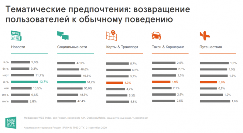Тематические предпочтения россиян также вернулись к обычному поведению в интернете. Для сравнения, в апреле новостные ресурсы каждый день посещали около 14% россиян, то в июле — порядка 9%, как в начале года. В социальные сети в июле каждый день стали заходить 47% населения, тогда как в апреле это делали 51%. При этом восстановилась аудитория навигационных сервисов и карт — в июле их вновь посещали каждый день около 6% населения, сервисов такси и каршеринга — 2,5%, и трэвел-ресурсов — 1,6%.