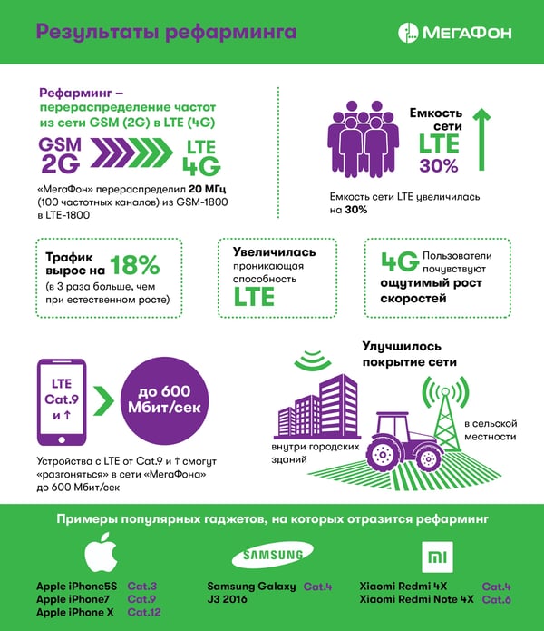 «МегаФон» первым среди столичных операторов перераспределил 20 МГц из частот GSM под нужды сети LTE-1800 – ключевого диапазона для развития сети. Благодаря проведенному рефармингу, оператор теперь обладает самой широкой частотной полосой в сетях LTE-2600 (40 МГц) и LTE-1800 (20 МГц), а абоненты, пользующиеся 4G, получают ощутимое увеличение скоростей.