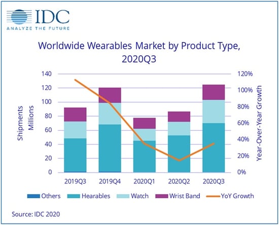 По сообщению аналитической компании IDC, продажи смарт-часов, фитнес-браслетов и многофункциональных беспроводных наушников (носимой электроники) по всему миру в третьем квартале 2020 г. составили 125 млн устройств, увеличившись на 35,1% по сравнению с аналогичным периодом прошлого года. До этого рынок падал четыре квартала подряд.