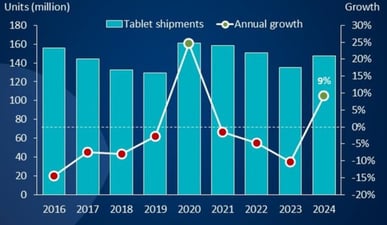 В России, судя по оценке Группы «М.Видео — Эльдорадо», продажи планшетов выросли в 2024 г. на 22% в количественном выражении год к году. Мировой статистики именно по продажам в открытом доступе пока нет, но отгрузки «таблеток» за прошлый год также исправно росли, — по данным Canalys, на 9,2%; до 147,6 млн единиц. В последнее время для этого сегмента глобального ИТ-рынка характерен четырёхлетний цикл «резкий взлёт поставок — поступательный спад», так что есть надежда, что в 2025-м, даже если отгрузки планшетов в канал снова сократятся, то ненамного, что позволит производителям и каналу в целом увереннее планировать свои операции, пишет ITBestsellers.
