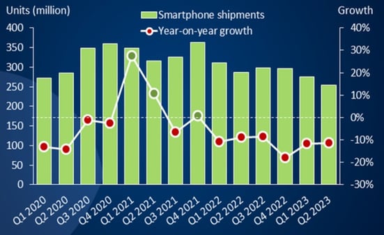 Как уже робко предполагали в Canalys, подводя итоги I кв. текущего года, динамика глобальных поставок смартфонов, судя по всему, нащупала дно. Речь здесь именно о динамике, а не об отгрузках в абсолютном количественном выражении. Если с января по март мировые поставки смартфонов сократились год к году на 12%, то с апреля по июнь аналогичный спад составил уже 11%. Учитывая, что наиболее провальным за последние примерно три года по этому показателю стал IV кв. 2022-го, аналитики взяли на себя смелость утверждать, что это вот небольшое, но вполне измеримое снижение скорости сокращения поставок можно рассматривать как первый предвестник грядущего (в некоторой перспективе) восстановления смартфонного рынка, пишет ITBestsellers.