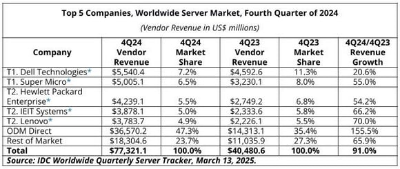 Аналитики IDC опубликовали отчёт о мировом рынке серверов за IV кв. 2024 г., особенно примечательный тем, что данные в нём представлены не в количественном, как это чаще всего бывает, а в денежном выражении. И результаты эти по-настоящему впечатляют, пишут в ITBestsellelrs: даже с учётом не самой простой макроэкономической ситуации выручка поставщиков серверных систем за последние три месяца прошлого года превысила 77,3 млрд долл. США, превзойдя достижение аналогичного периода 2023 г. сразу на 91%.