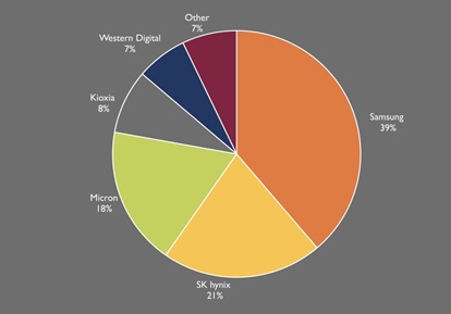 Среди производителей микросхем в общем зачёте (NAND и DRAM совместно) продолжают лидировать Samsung, SK Hynix и Micron, суммарная доля которых приближается в 80% ( см. рис. 2). Далее с заметным отрывом, но с осязаемыми долями следуют Kioxia, WD и все прочие.
