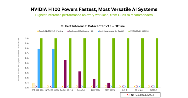Отдельно стоит отметить, что системы NVIDIA HGX H100 с восемью GPU H100 показали наивысший результат по пропускной способности в каждом тесте MLPerf Inference.