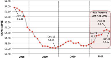 Как видно из графика средней цены условной микросхемы DRAM, этот показатель достиг в августе значения 4,77 долл. США, что на целый 41% больше, чем было в январе 2021-го, — 3,37 долл. А уже в сентябре средняя цена DRAM снизилась до 4,62 долл., потеряв к августу 3%.