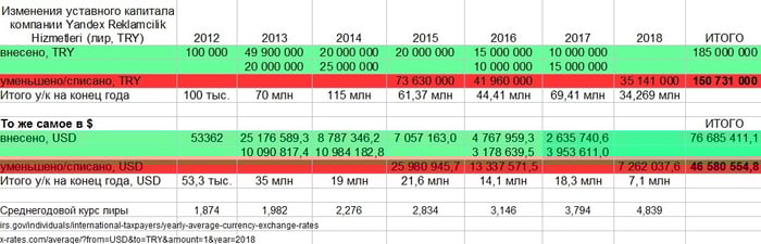 Поэтому сумму вливаний в уставный капитал Yandex Reklamcilik можно считать суммой инвестиций в проект «Яндекс.Турция». По подсчетам CNews (см. таблицу на основе двух десятков документов), она составила 185 млн турецких лир, а списания и сокращения уставного капитала выразились в 151 млн лир. В долларах США это $77 млн инвестиций и $47 млн зафиксированных потерь.