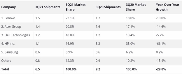 Заметнее всего этот спад спроса ударил по компании HP: если в III кв. 2020 г. хромбуков под этим брендом занимали около трети данного сегмента, то год спустя, после снижения объёмов отгрузок на 66%, сохранили за собой лишь вдвое меньшую долю.