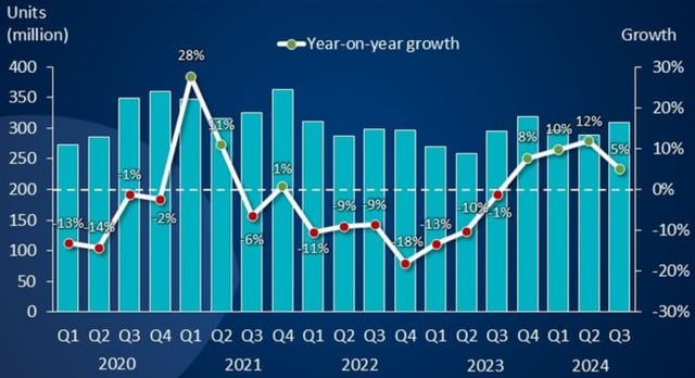 По данным компании Canalys, с июля по сентябрь 2024 г. в мире было отгружено в канал продаж около 300 млн смартфонов, — на 5% больше, чем за тот же квартал прошлого года. И хотя динамика глобального смартфонного рынка сохраняется, таким образом, позитивной уже четыре квартала подряд, наблюдавшийся прежде поступательный рост этого показателя (8% год к году в IV кв. 2023-го, 10% в I кв. 2024 г., 12% во II кв.) сменился очевидным и достаточно резким спадом — до указанных 5%. Это передаёт ITBestsellers.