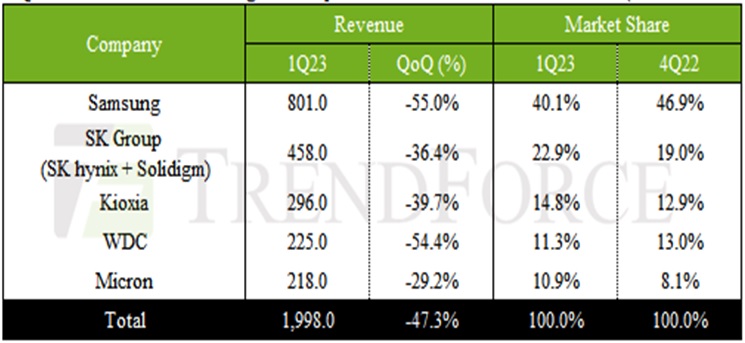 Первая пятёрка глобальных брендированных поставщиков SSD по объёму выручки за I кв. 2023 г.