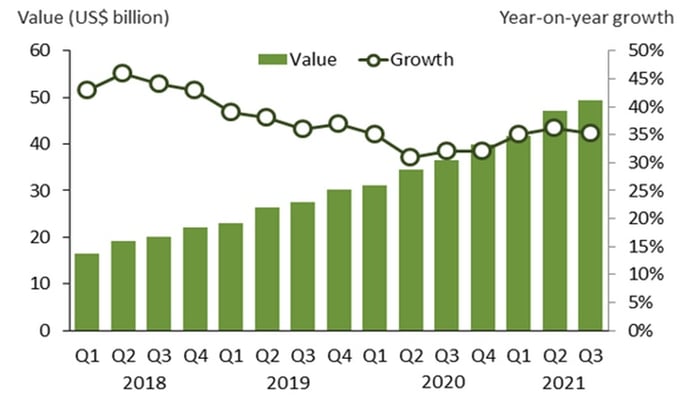 По данным компании Canalys расходы на услуги по предоставлению доступа к облачной ИТ-инфраструктуре в III кв. текущего года выросли на 35% по сравнению с тем же периодом 2020 г. — до 49,4 млрд долл. США.