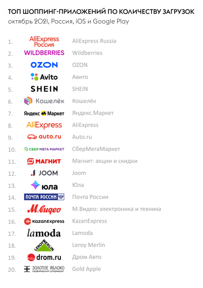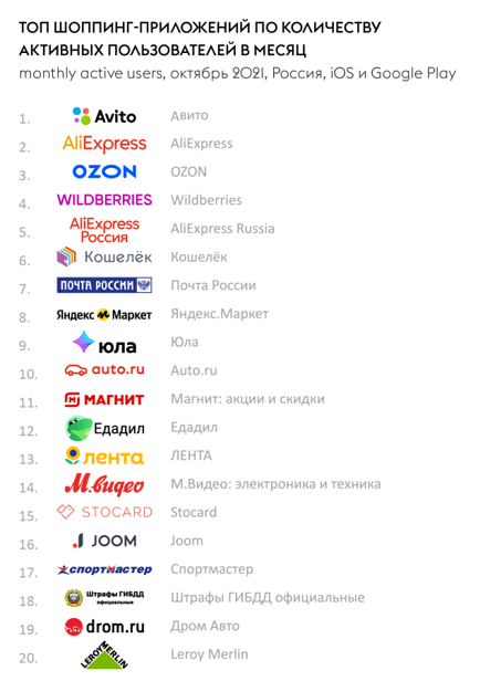 Сервис уступает лишь в рейтинге по количеству загрузок — здесь в тройку лидеров вошли AliExpress Russia, Wildberries и Ozon. Приложения Wildberries, «Авито» и Ozon присутствуют в топ-5 во всех представленных App Annie рейтингах.