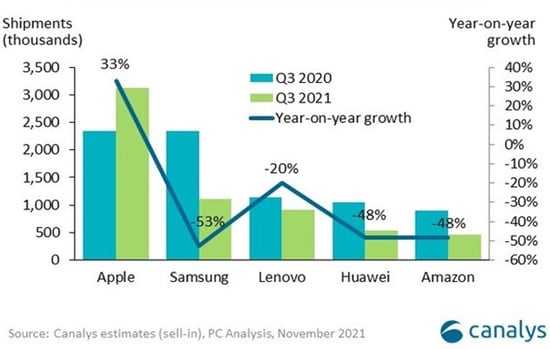 Поставки планшетов в Западной Европе упали на 20% и составили 6.9 млн штук. В период Q3 2020 было продано экстраординарное количество планшетов, которые тогда закрыли проблему нехватки ПК. Теперь же идёт коррекция в сторону снижения, так как первичная пользовательская база сложилась и насытилась. Несмотря на общее снижение отгрузки планшетов Apple за год увеличились на 33% и достигли 3.1 млн штук, что составило 45% всего планшетного рынка в регионе, тогда как поставки остальных брендов первой пятёрки рынка показали двузначное снижение.