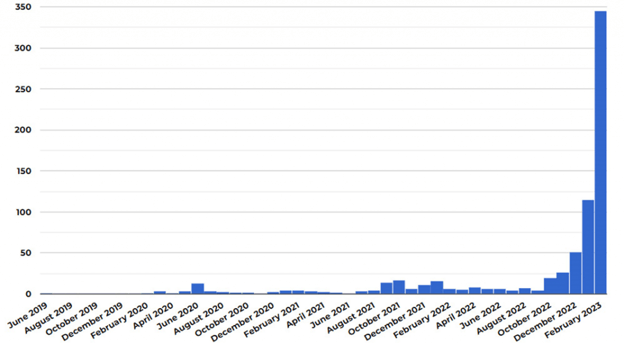 Кларк опубликовал диаграмму с количеством авторов, которых журналу приходится банить каждый месяц. В феврале этого года количество стало непропорционально высоким — более 500 человек. Хотя год назад в этом же месяце было около 20 банов.