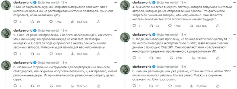 Для Clarkesworld пока что нет полноценного решения этой проблемы. А многие полумеры нанесут больший ущерб честным писателям, нежели любителям быстро заработать на ИИ-технологиях.