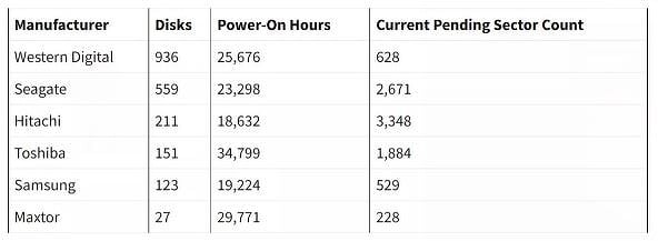 Hitachi оказалась на последнем месте — ее винчестеры наработали всего-навсего 18,6 тыс. часов. В перечне участвующих брендов оказался и Maxtor — в начале XXI века являвшийся одним из крупнейших производителей HDD. С 2006 г. он находится под контролем Seagate, но его винчестеры все еще демонстрируют высокие показатели надежности — второе место и около 30 тыс. часов.