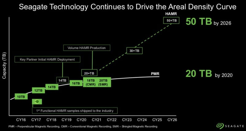 Согласно графику дальнейшего наращивания емкости жестких дисков, официально представленному Seagate в рамках конференции по подведению квартальных итогов, компания намерена довести емкость своих жестких дисков до 50 ТБ с использованием новой технологии записи HAMR (Heat-Assisted Magnetic Recording, магнитная запись с локальным разогревом).