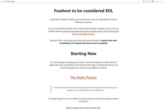 Проект Fosshost уже начал перестал работать. Об этом сказано на его официальном сайте, который на момент выхода материала продолжал функционировать, но содержал лишь сообщение о закрытии сервиса.