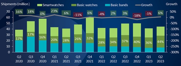 Ранее отмечавшееся относительное сокращение подсегмента фитнес-браслетов, среди всех назапястных гаджетов отличающихся минимальным набором возможностей, ещё с I кв. 2022 г. практически прекратилось: к настоящему времени доля этих наиболее бюджетных устройств в общем объёме поставок остаётся на уровне 19%. Не демонстрирует явно выраженной позитивной динамики и верхний подсегмент самых дорогих умных часов с возможностью доустановки пользователем приложений — по понятным макроэкономическим причинам. Таким образом, основным драйвером сегмента выступают занимающие промежуточное положение умные часы с фиксированной изготовителем функциональностью.