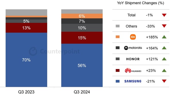 На фоне общего сокращения глобального спроса на смартфоны (по крайней мере, темпов его прироста) сегмент складных мобильных гаджетов с гибкими дисплеями выглядел вполне привлекательным — по крайней мере, до середины текущего года. Однако в III кв. 2024-го, как свидетельствует Counterpoint Research, и здесь наметился удручающий нисходящий тренд, передаёт ITBestsellers. Так, эталонные складни с логотипом Samsung, на которые до сих пор приходится более половины глобальных отгрузок в этом сегменте, потеряли по сравнению с тем же кварталом 2023 г. 21% своей рыночной доли, — в основном в пользу более демократичных изделий китайских вендоров, таких как Huawei и Xiaomi.