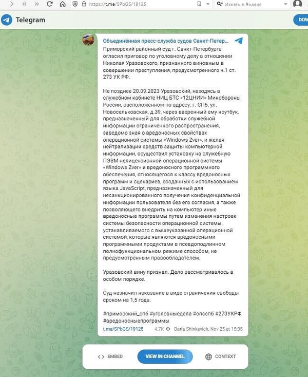 Также в этой публикации сказано, что свое злодеяние Уразовский проделал «не позднее» 20 сентября 2023 г. Утверждается, что он находился в «служебном кабинете НИЦ БТС "12ЦНИИ" Минобороны России, расположенном по адресу: г. СПб, ул. Новосельковская, д.39», и что все действия он совершил «через вверенный ему ноутбук, предназначенный для обработки служебной информации ограниченного распространения».