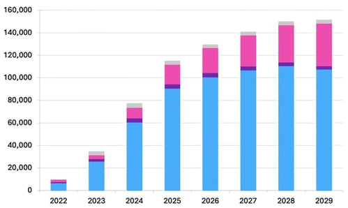 По оценке аналитиков Omdia, потребность мирового рынка в серверных графических процессорах и иных полупроводниковых ускорителях для расчётов с использованием различных моделей искусственного интеллекта будет расти, по меньшей мере, до 2029 г., когда выраженные в долларах обороты этого сегмента более или менее выйдут на плато. Если в 2022 г. его объём не достигал даже 10 млрд долл. США, то по итогам 2024 г. он оценивается в 78 млрд долл., а к 2029-му должен вырасти до 151 млрд долл.
