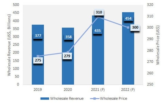 При этом глобальный объём продаж смартфонов в деньгах, согласно прогнозу, в текущем году вырастет на +21% в годовом выражении и достигнет $435 млрд, — это максимальный показатель за всю историю развития рынка (см. рисунок). Причины такого увеличения — как в росте количества проданных смартфонов, по прогнозу — на +9% YoY, так и в повышении средней цены.