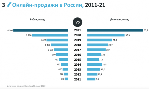 Аналитическая компания Data Insight, специализирующаяся на онлайн-ритейле, опубликовала ежегодный отчёт «Интернет-торговля в России 2021». По данным компании, в 2021 году объём рынка розничной интернет-торговли в России увеличился на 52% год к году и достиг 4,1 трлн руб. Количество онлайн-заказов составило 1,7 трлн — показатель вырос на рекордные 104%. Средний чек составил 2,4 тыс. руб., что на 26% меньше, чем в 2020 году.