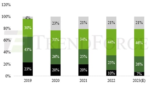 Как видно из диаграммы, доля таких моделей неуклонно нарастала и к концу нынешнего года может приблизиться к половине модельного предложения. Доля более продвинутых смартфонов с четырьмя только тыльными камерами и более, резко взлетев в 2020 г. остаётся с тех пор примерно на одном уровне. А процент мобильных телефонов с числом камер два и менее с тех пор неуклонно сокращается.