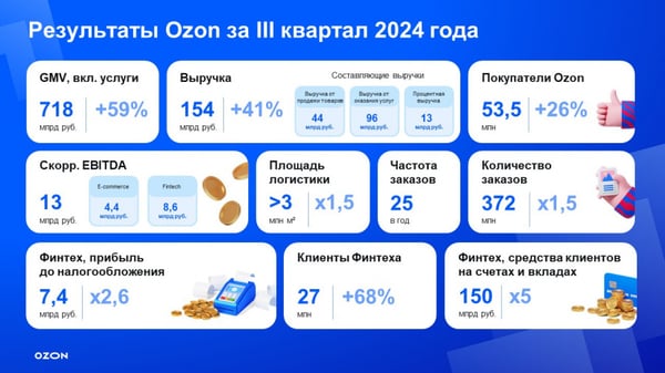 Выручка финтех-направления возросла почти втрое, до 24,4 млрд руб. Прибыль до налогообложения сегмента выросла на 163%, до 7,4 млрд руб. База активных пользователей финансовых сервисов Ozon увеличилась на 68%, до 27 млн клиентов. Сумма привлечённых средств пользователей показала рост более чем в пять раз, до 149,8 млрд руб.